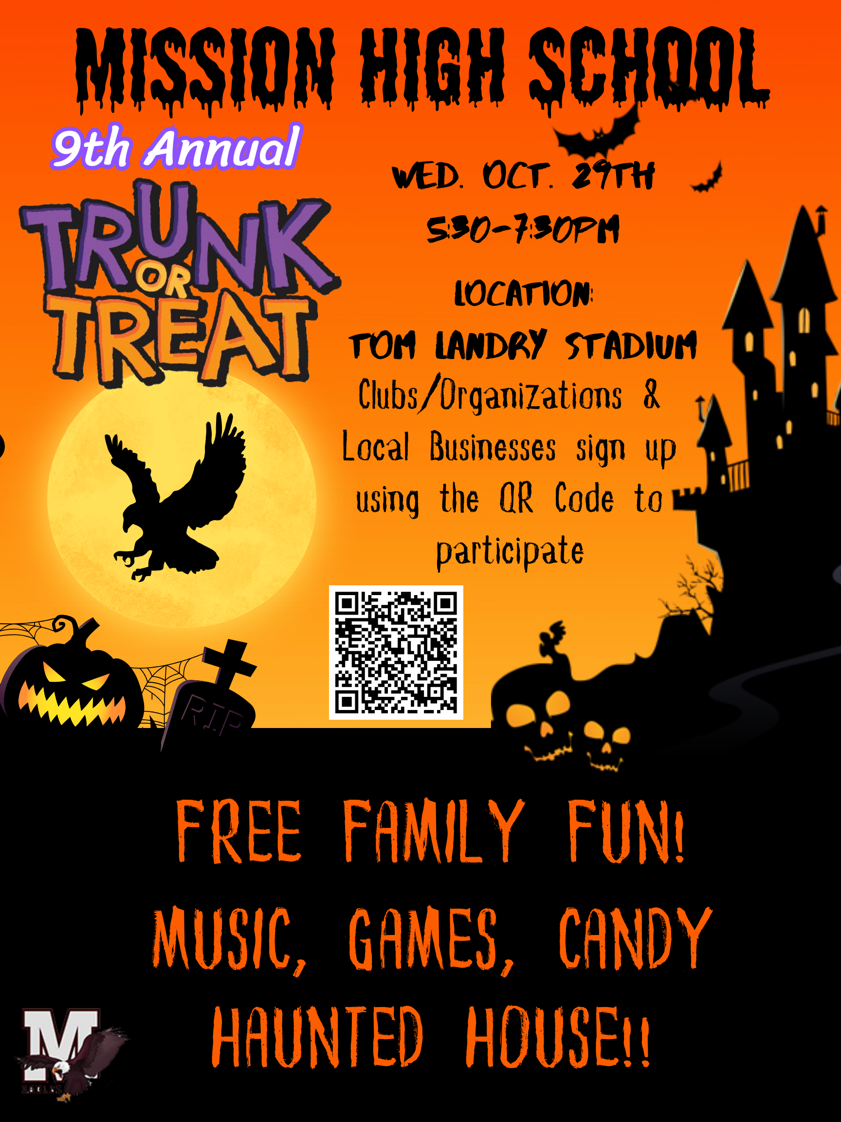 Mission High School 9th Annual Trunk Or Treat Date: October 29 Time: 5:30 PM – 7:30 PM Location: TOM LANDRY STADIUM